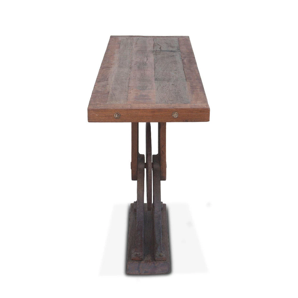 Rectangle console table with a reclaimed teak wood top featuring a plank design